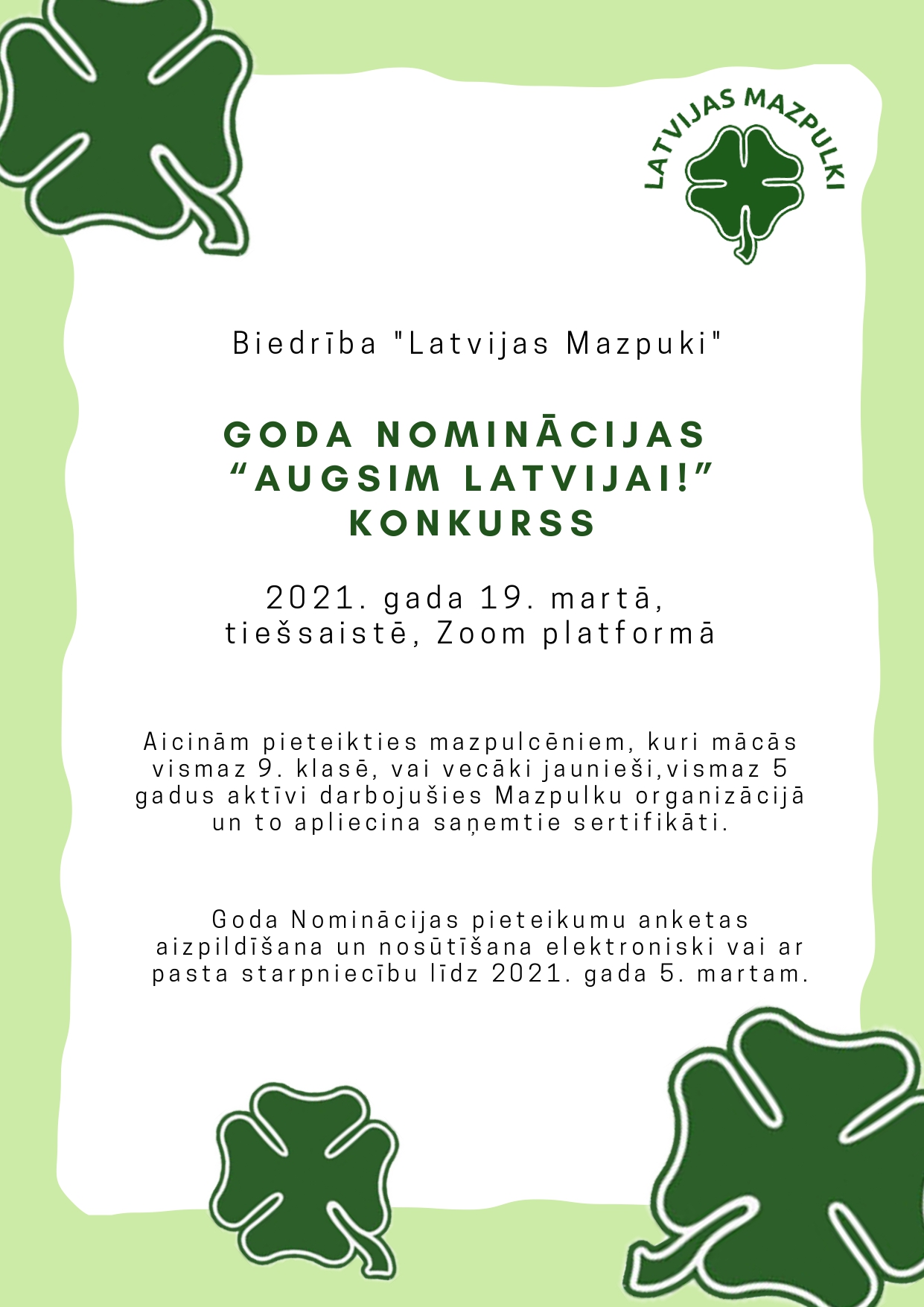 Ņemot vērā pulcēšanās ierobežojumus, Goda Nominācijas pretendentu vērtēšana notiks tiešsaistē, 19. martā, platformā Zoom. Lai palīdzētu mazpulcēniem labāk sagatavoties tiešsaistes prezentācijai, marta sākumā organizēsim semināru Goda Nominantiem.