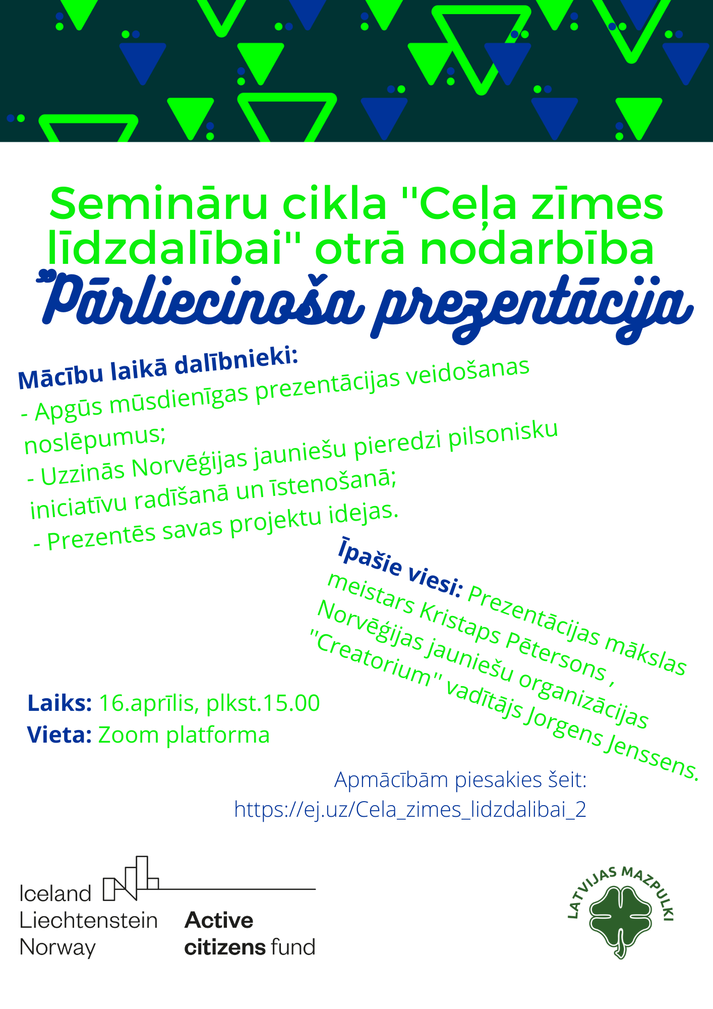 Iespēja piedalīties semināru cikla ”Ceļa zīmes līdzdalībai” nodarbībā ”Pārliecinoša prezentācija”.
