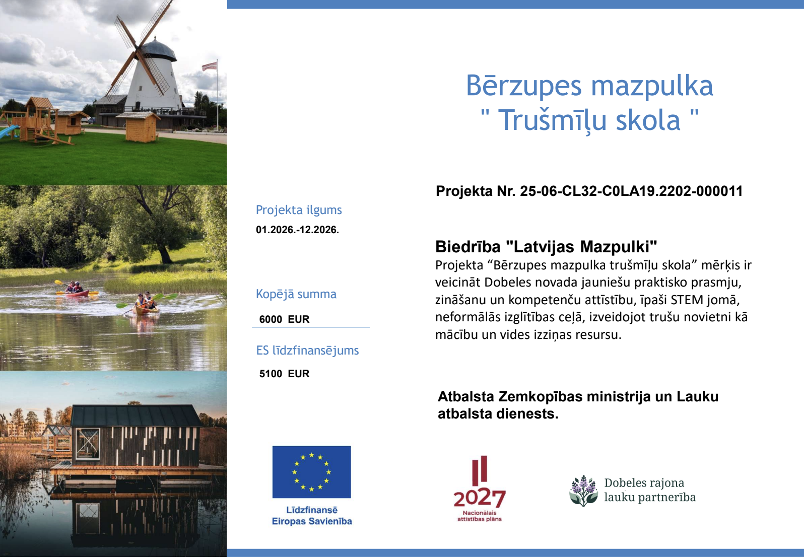 Ar prieku mēs paziņojam, ka Lauku atbalsta dienests ir apstiprinājis biedrības “Latvijas Mazpulki” iesniegto projekta iesniegumu Nr.25-06-CL32-C0LA19.2202-000011 “Bērzupes mazpulka Trušmīļu skola”, kas iesniegts vietējā rīcības grupā “Dobeles rajona lauku partnerība”.